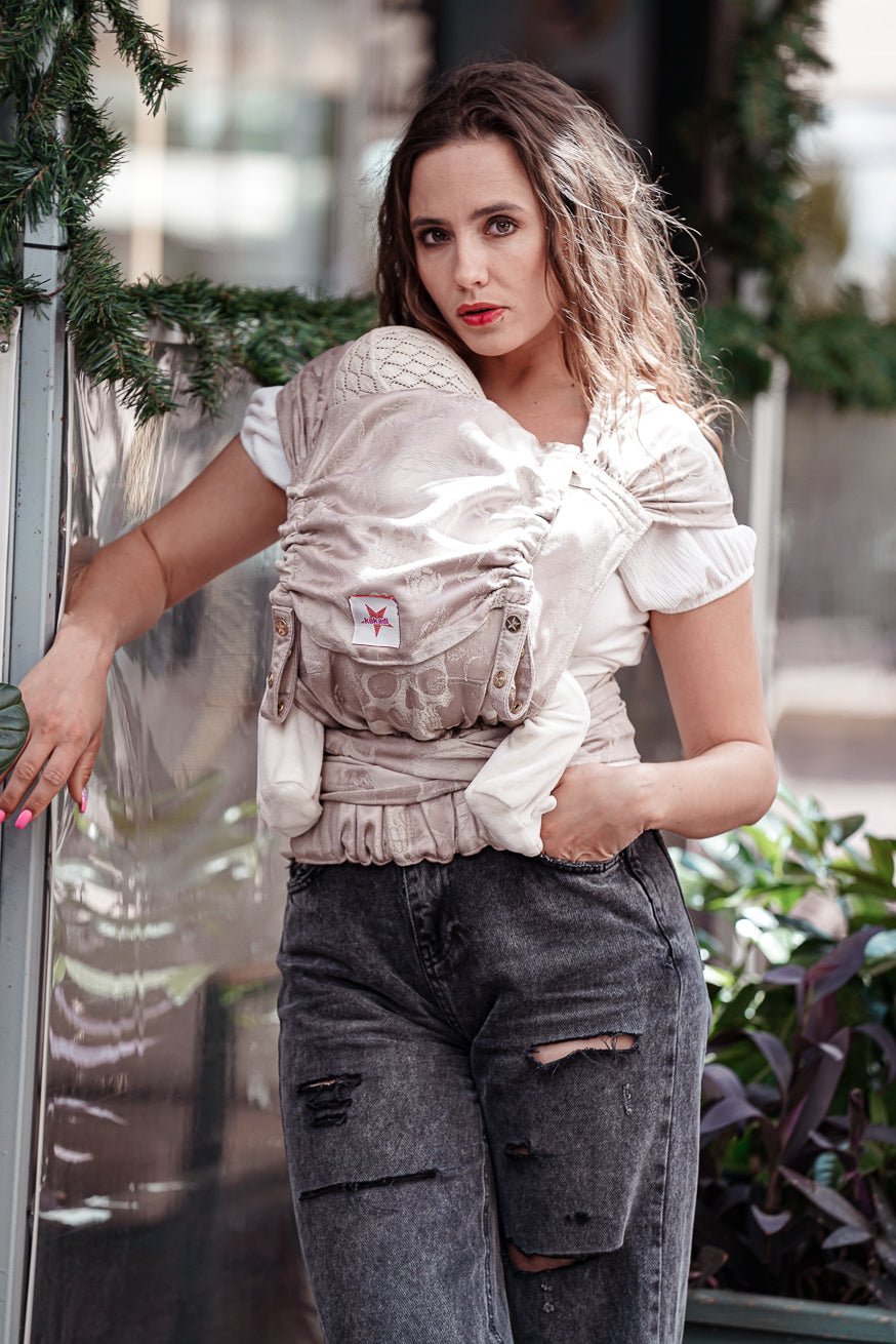 Dieses besondere KOKADI Design kombiniert Grusel und Gemütlichkeit auf einzigartige Weise. Mit einem fesselnden Design aus schaurigen Schädeln und dem silky Beige ist diese Babytrage ideal, um dein Baby stilvoll zu tragen.