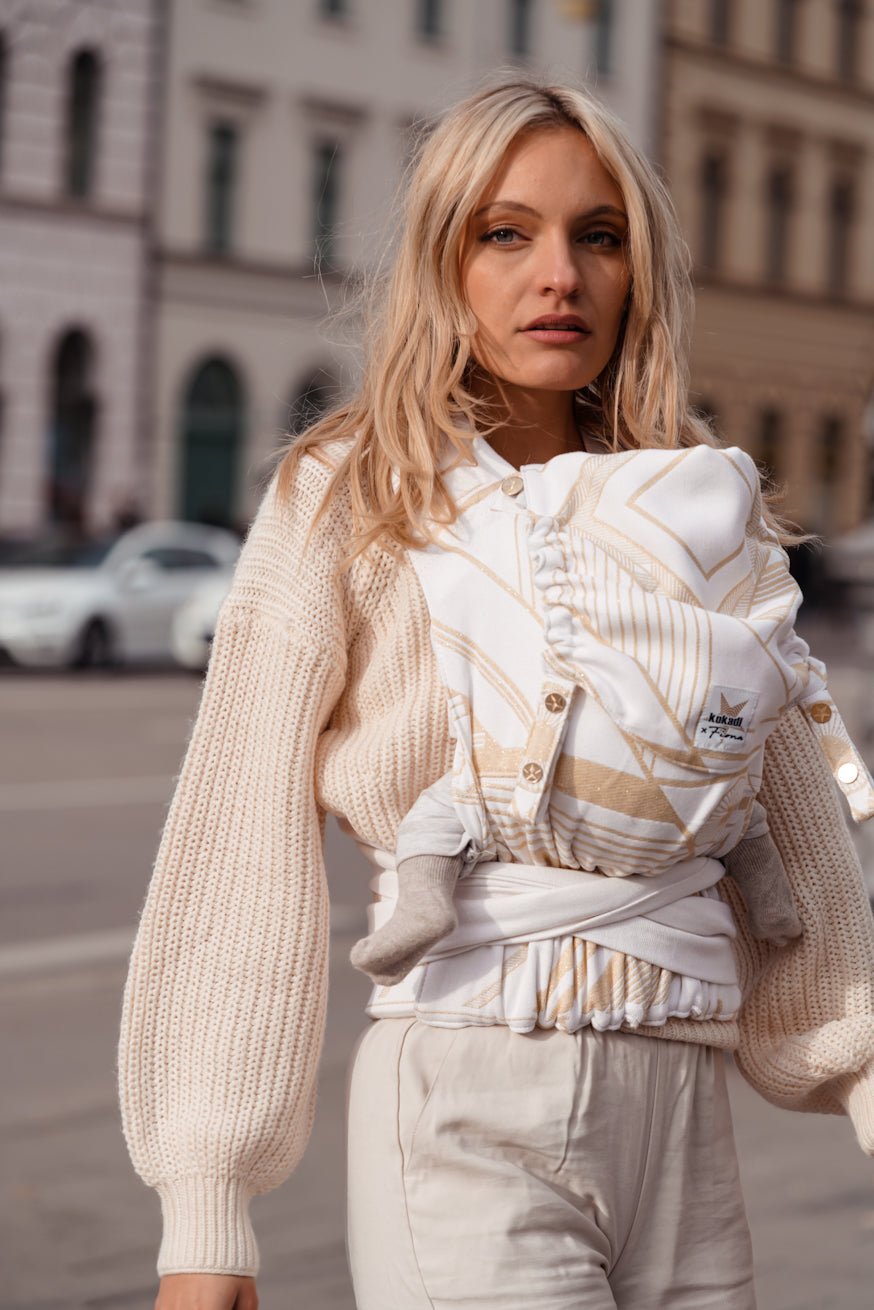 Mit goldenem Glitzergarn sind verschiedene geometrische Formen eingewebt und der perfekt abgestimmte creme-weiße Grundton machen diese Babytrage zum absoluten Eye Catcher.